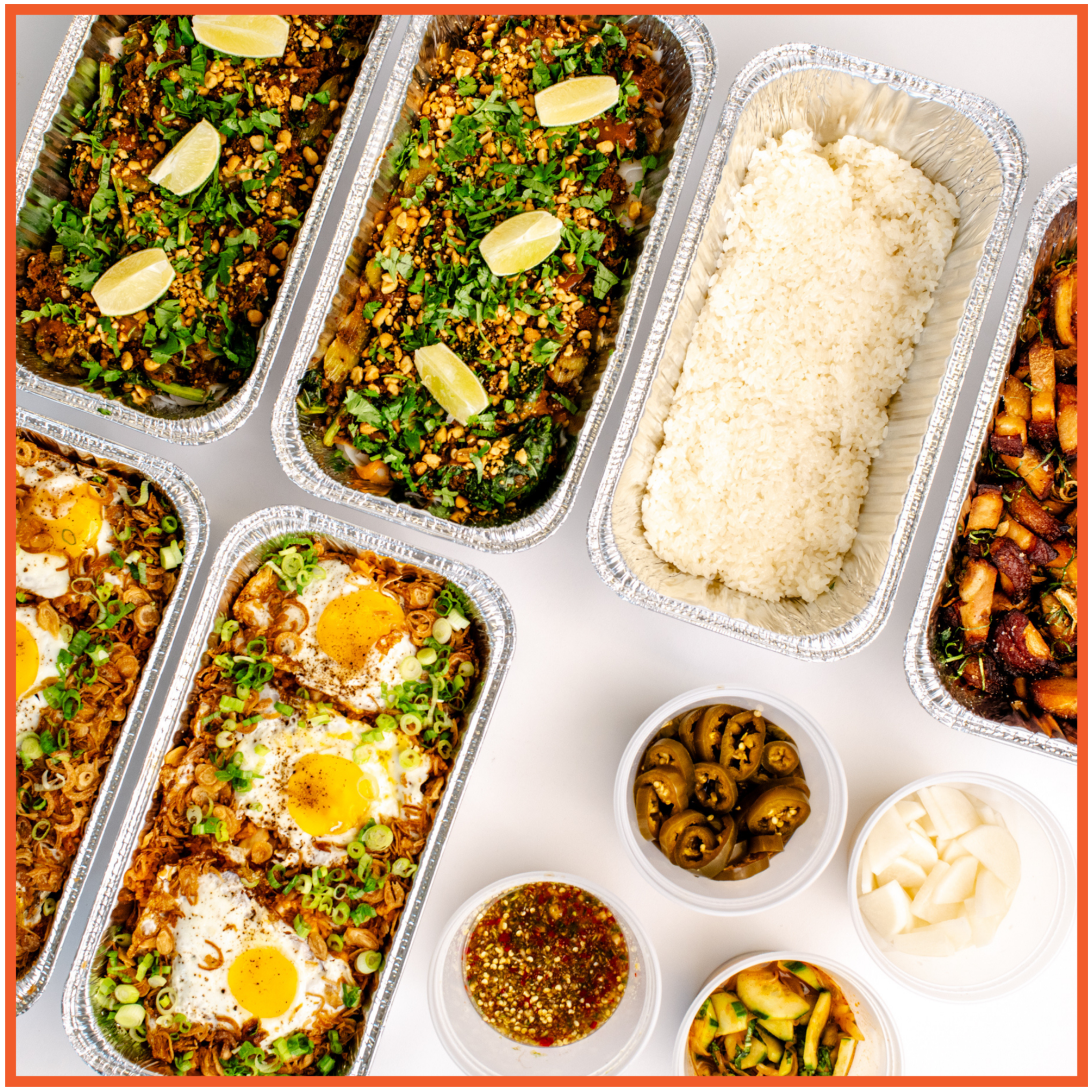 Pho base (rice noodles, sriracha, hoisin, lime, thai basil, cilantro, beansprouts, scallions, and onion)